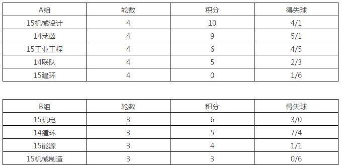 “烽火杯”足球赛于10月24日正式开赛,2014级与2015级本科生共组建了九支队伍参赛。九支队伍分为A、B两组展开了为期三周的小组赛。11月9日,所有小组赛全部结束,最终A组15级机械设计队积10分、14级莱茵队积9分分列小组一、二名出线,B组15级机械电子队积6分、14级建环队积5分分列小组一、二名出线。以下为积分榜与射手榜: