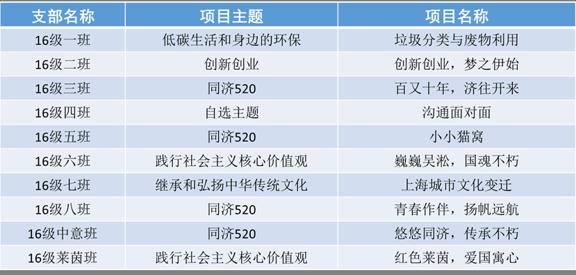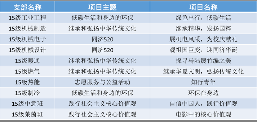 2017年度“凝聚青年,砥砺前行”主题团日活动的通知》,制定并公布了以下参考主题:践行和培育社会主义核心价值观;继承和弘扬中华传统文化;低碳生活/身边的环保;公益活动/志愿服务;创新创业;同济520;百年ME;自选主题。