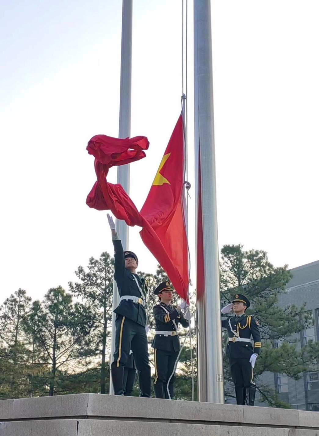 上午7时20分,朝晖散去寒意,热血更胜寒风,升旗仪式正式开始。国旗护卫队精神抖擞,口号响亮,迈着铿锵有力的步伐走向升旗台。全体同学怀着拳拳爱国之情庄严肃立,伴随着升旗手一声响亮的“向国旗敬礼”,雄壮的国歌在耳边响起,鲜艳的五星红旗迎着晨曦冉冉升起。