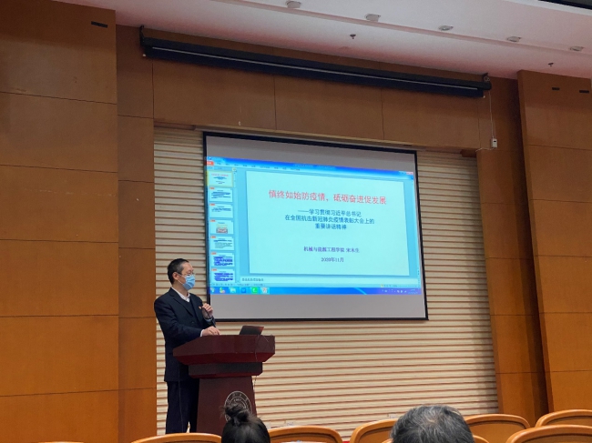 随后,宋木生书记为全体教职工上抗疫专题党课,学习贯彻习近平总书记在全国抗击新冠肺炎疫情表彰大会上的重要讲话精神。带领全体教职工回顾自新冠肺炎疫情以来,党中央带领人民群众开展的各项 疫情防控工作,提醒大家,慎终如始防疫情,砥砺奋进促发展。