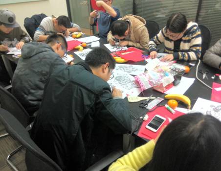 活动在下午6点准时开始,首先大家共同观看了《蔚县剪纸》记录片,对剪纸,尤其是蔚县剪纸的历史传承、技法、特色和现状等有了初步的了解,张泽宇同志对蔚县剪纸明快绚丽的色彩和优美逼真的造型分享自己的心得。接着,支部书记苏炎同志讲解了剪纸的方法要领和注意事项,全体成员开始构思自己的作品并动手创作。在剪纸过程中,大家不时的进行交流,侯震霞同志对刻刀的使用和剪裁的顺序分享了自己的经验。