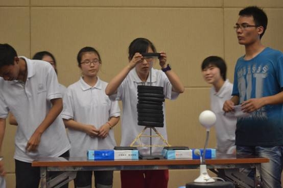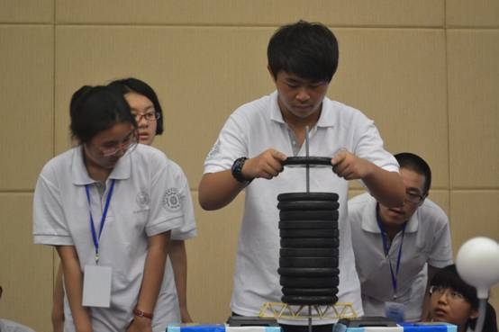 下图为牙签搭桥的比赛现场,选手正在加砝码