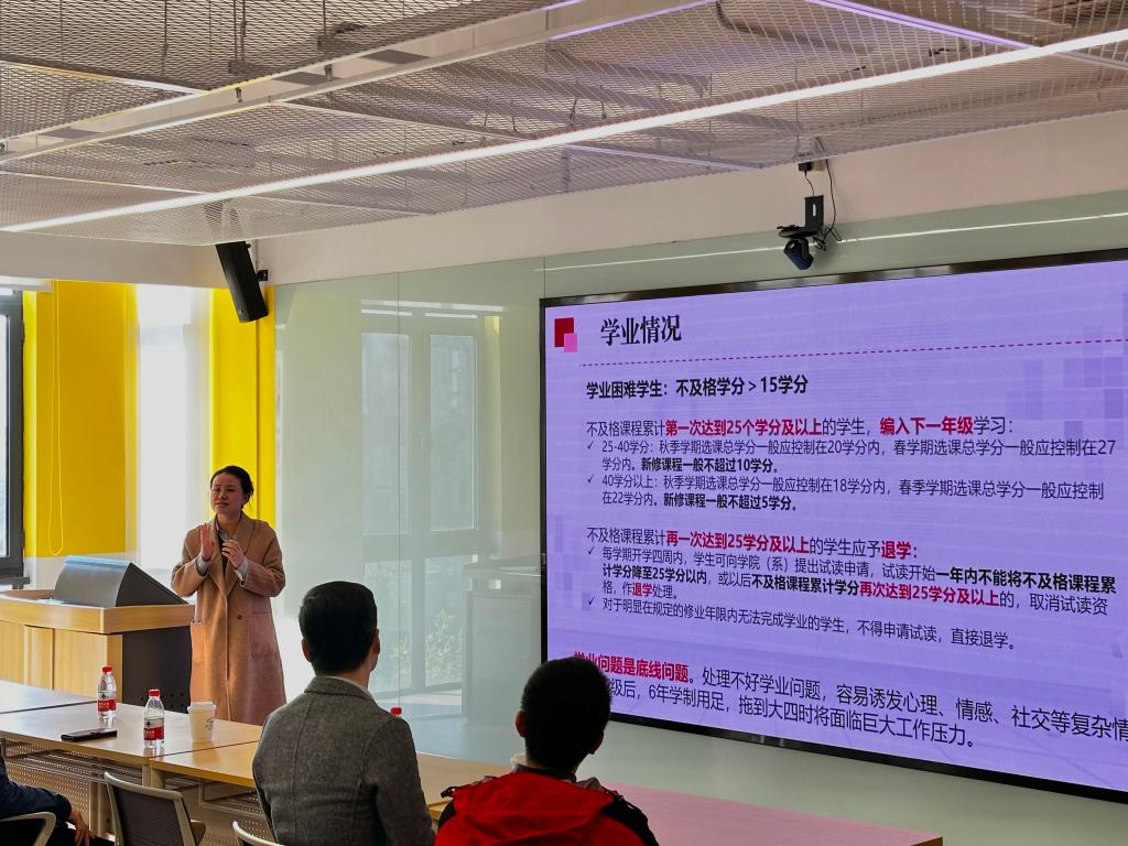 辅导员王佳琪老师分析了本科生存在的主要学业问题,介绍了学院学业帮扶工作的内容与成效,并对班主任如何开展学业帮扶工作给与建议。辅导员钱偲老师详细介绍了奖助学金的构成、评审制度、评审流程以及班主任开展相关工作时的注意事项,并对麻豆视频