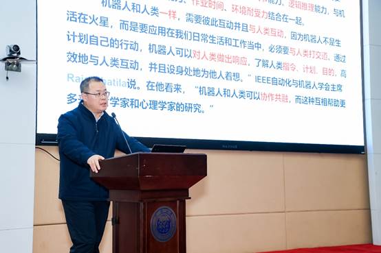 俄罗斯自然科学院外籍院士、东南大学李新德教授的报告由秦家虎教授主持,李新德教授以《人机共融下的机器人视觉导航》为题,围绕基于手绘地图的机器人视觉导航、基于手绘语义地图的机器人视觉导航、基于受限自然语言的机器人视觉导航、基于完全自然语言的机器人导航和基于多模态交互的机器人视觉导航五个方面的研究内容展开,并探讨了未来人机共融下的机器人技术的发展方向。